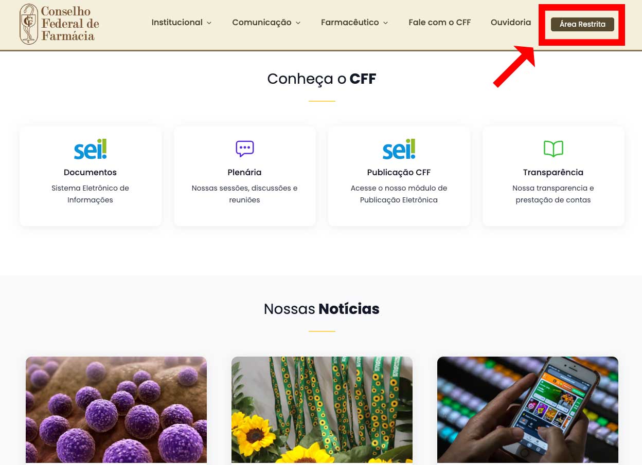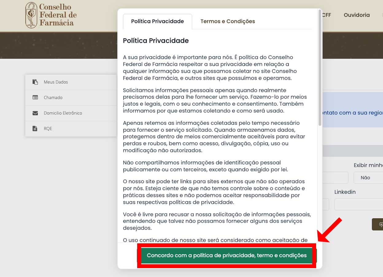 4. Ao entrar na área restrita, aparecerá automaticamente a Política de Privacidade e os Termos e Condições do CFF. Leia atentamente e clique no botão verde “CONCORDO COM A POLÍTICA DE PRIVACIDADE, TERMO E CONDIÇÕES”